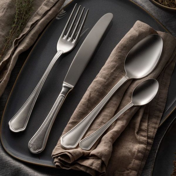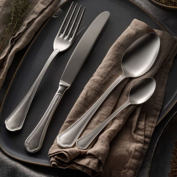 Domus plateado en mate, es una colección de cubiertos en acero inoxidable 18/10 arenado (mate) con acabado plateado con un espesor de 15 Micrones .