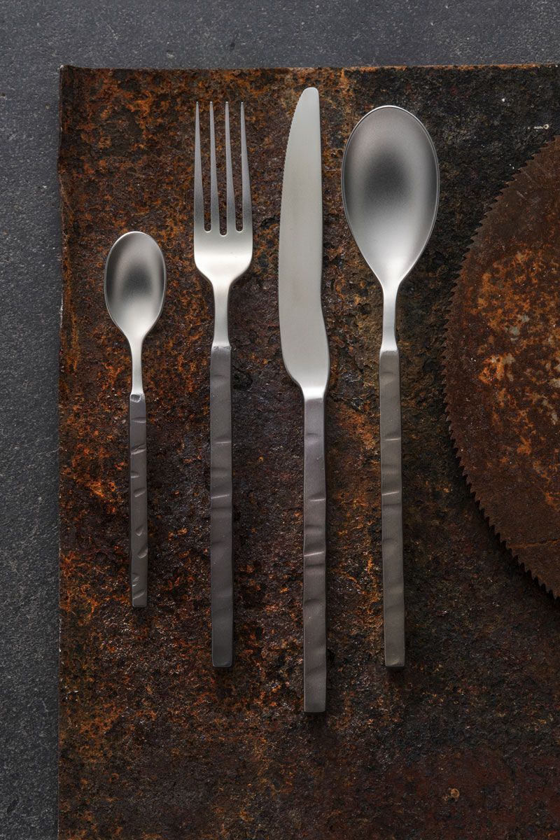 Realizada en acero 18/10 forjado, esta cubertería combina el minimalismo con el sabor “industrial” de los mangos cepillados y oxidados con un aspecto deliberadamente crudo y material a la sinuosidad de los vértices satinados. Lo más destacado está dado por el corte estilístico desigual y atractivo de las hojas de los cuchillos.