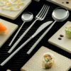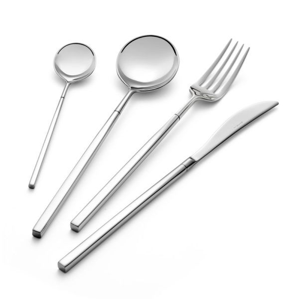 Kyoto es una línea de cubiertos forjados (a excepción de los palillos, que son huecos por dentro) realizada en acero 18/10 (AISI 304) en acabado brillo.
