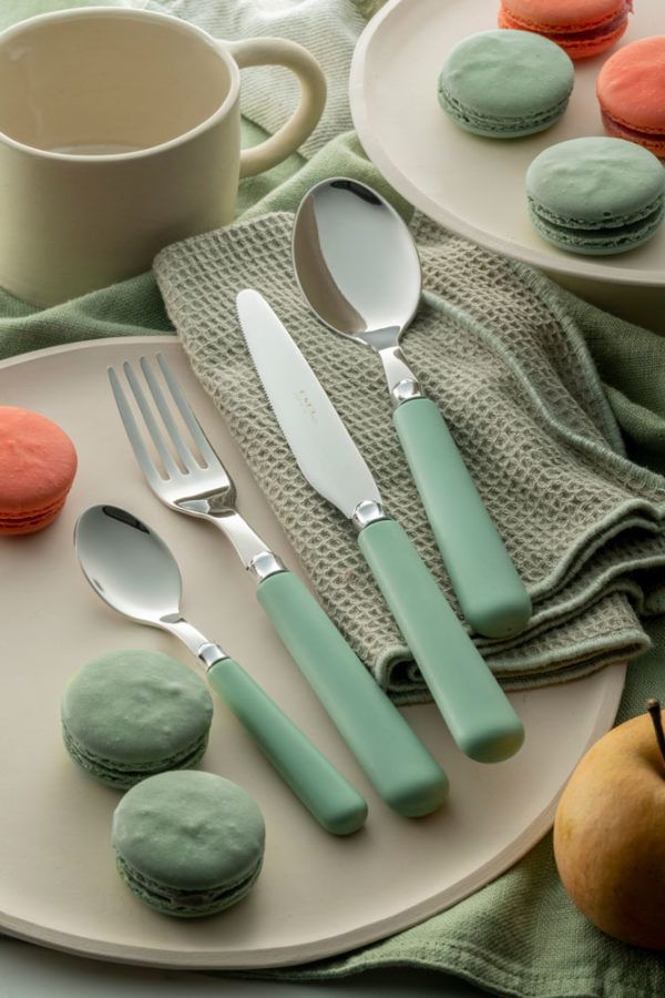 Macarons es una cubertería ergonómica con un importante mango caracterizado por colores pastel y nuevos tonos de moda: Verde Salvia, Rosa Polvo, Gris Arena, Ottanium, Marfil y Rojo Fresa.