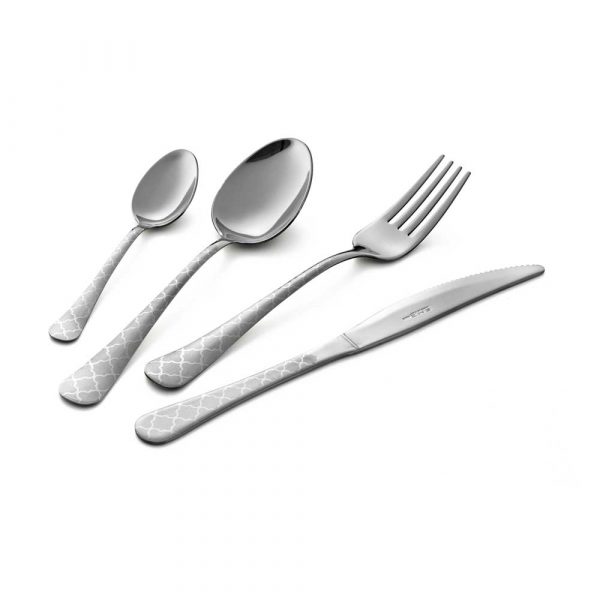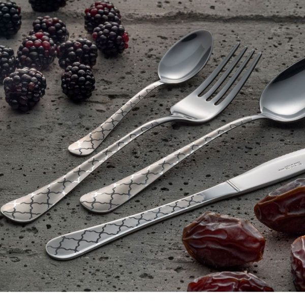 Esta cubertería se distingue por el particular diseño de efecto damasco realizado con láser de alta tecnología. Es una cubertería sinónimo de practicidad y sencillez pero embellecida por la elegante decoración clásica. Gracias a las líneas fluidas permite obtener siempre un excelente resultado en cualquier mesa.
