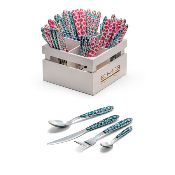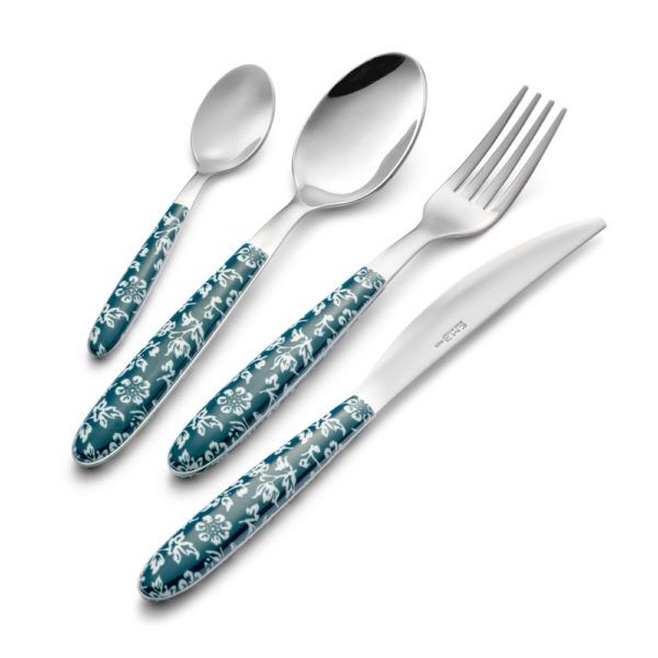 Vero Flowers es una colección de cubiertos con un diseño icónico caracterizado por un motivo típicamente inglés dibujado en el mango. El diseño, realizado con impresión indirecta por sublimación, con motivos del siglo XVIII se presenta en el clásico color verde inglés, un tono muy oscuro, intenso y decididamente elegante y refinado.