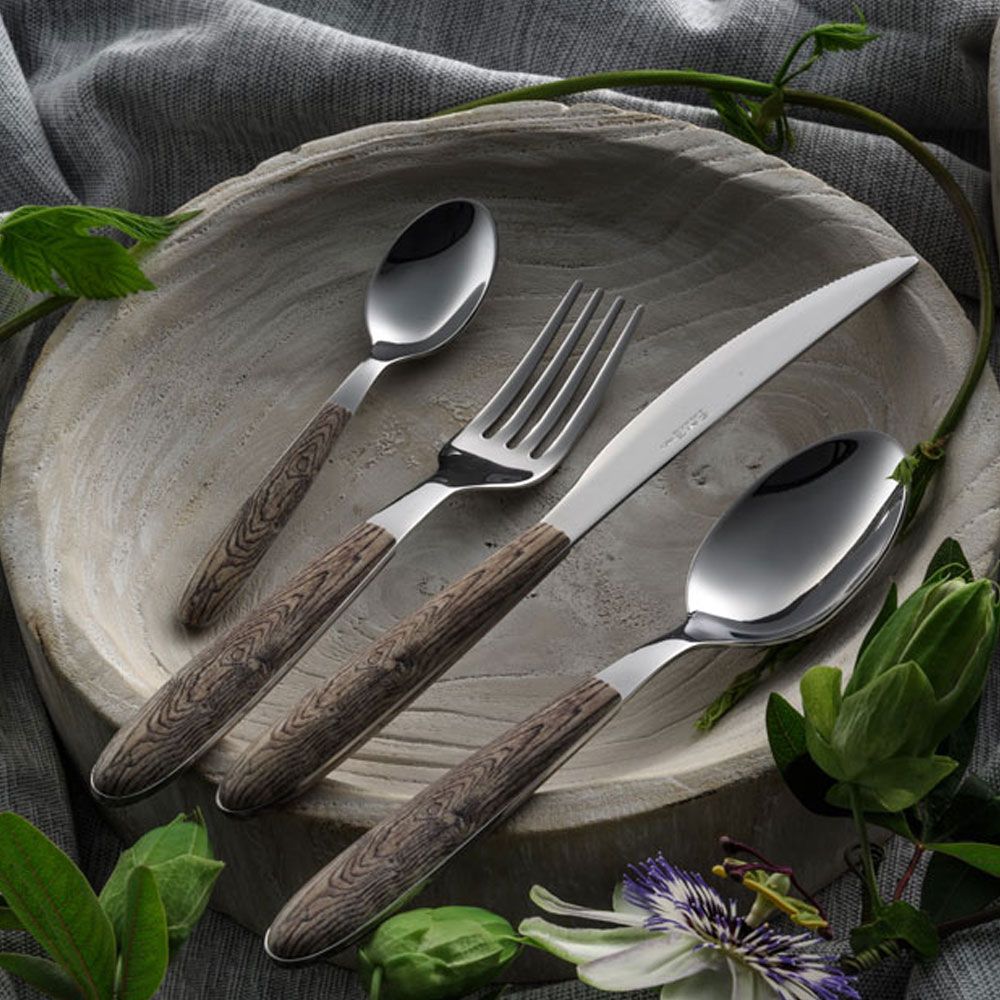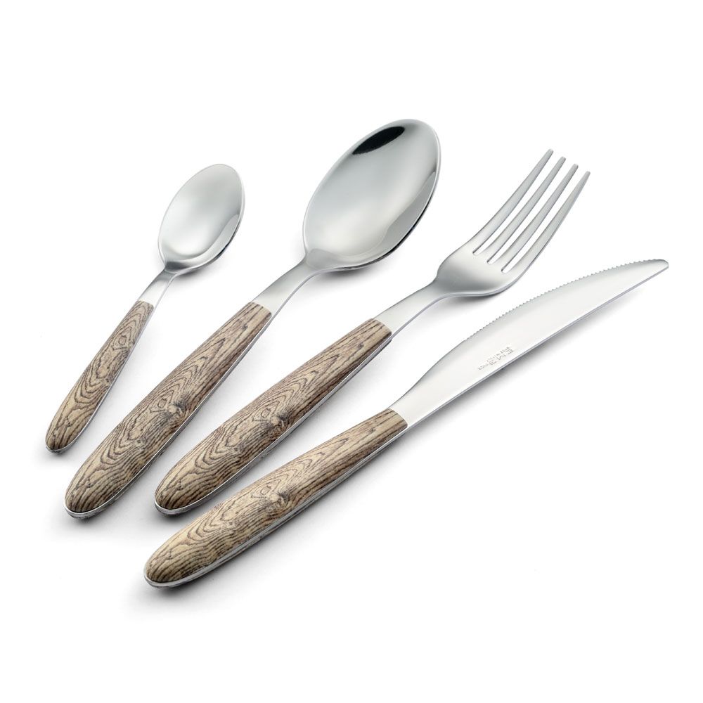 Vero Larice , es una colección efecto Madera Natural, la cubertería esta fabricada en acero inoxidable 18/0 con acabado pulido y mango de PBT soldado por ultrasonidos con decoración realizada con impresión por sublimación.