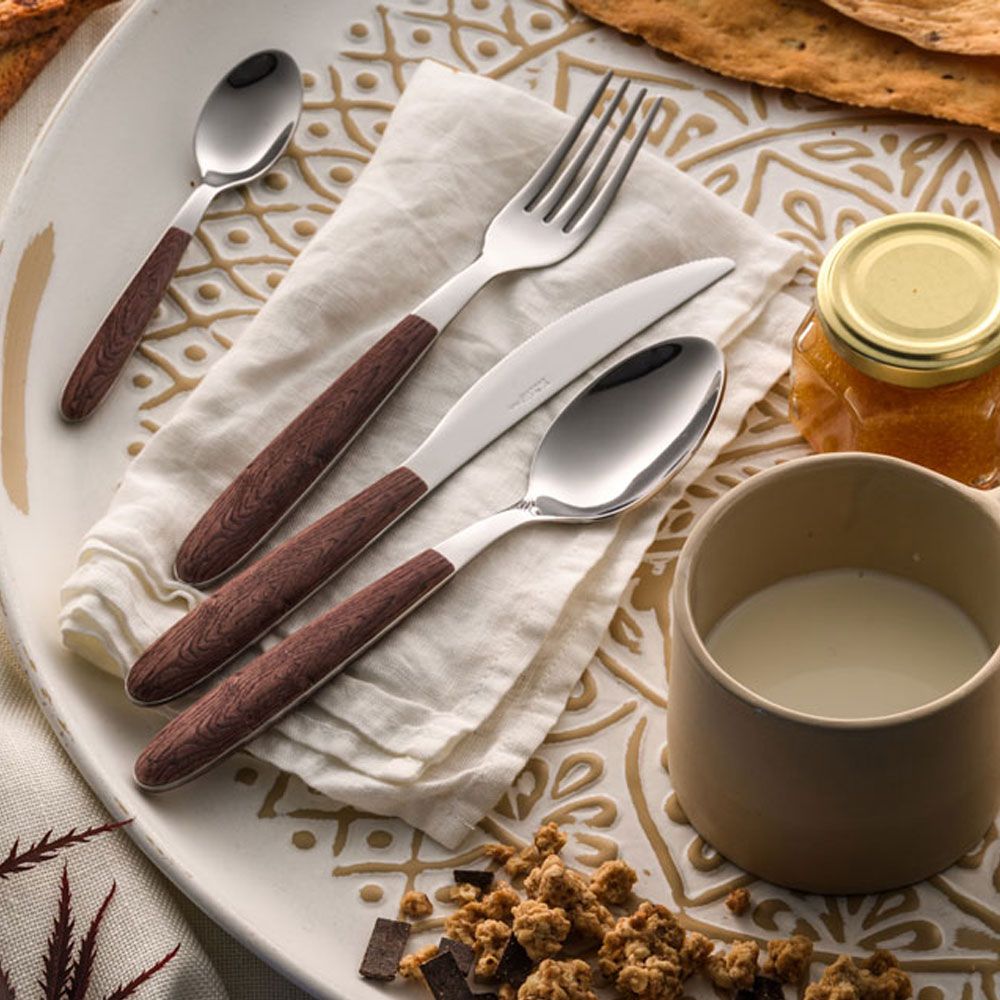 Vero Noce , es una colección efecto nogal, la cubertería esta fabricada en acero inoxidable 18/0 con acabado pulido y mango de PBT soldado por ultrasonidos con decoración realizada con impresión por sublimación.